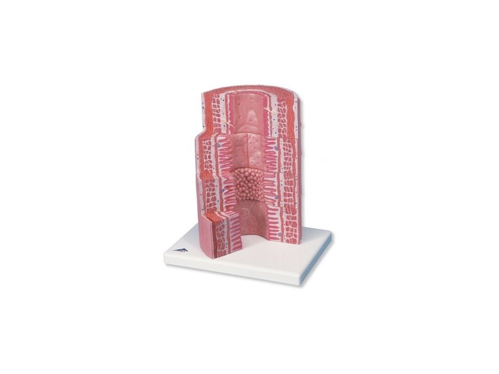 Model je velice praktickou vzdělávací pomůckou, která pomáhá s pochopením histologie trávicí soustavy. Model znázorňuje strukturu jemné tkáně čtyř charakteristických částí trávícího systému: