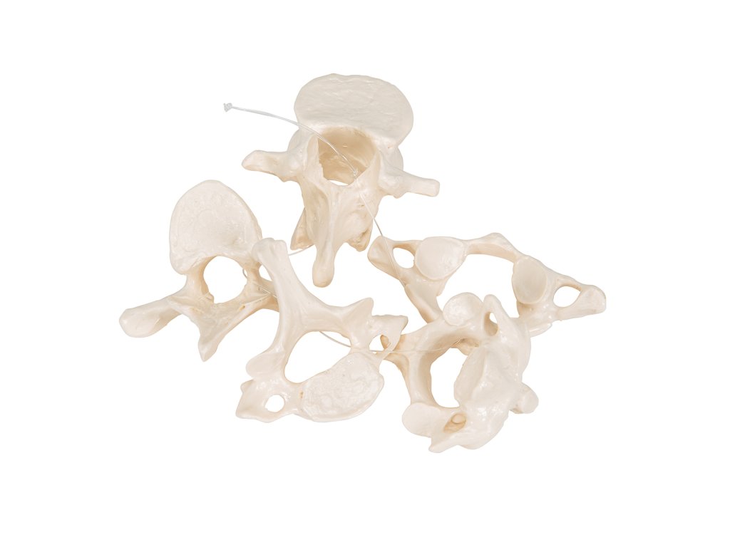 Anatomický model pěti obratlů je praktickou učební pomůckou pro studenty anatomie a budoucí lékaře. Součástí balení je pět různých obratlů: Atlas, axis, krční, hrudní a bederní obratle. Jednotlivé obratle jsou volně navlečené na nylonové šňůrce.