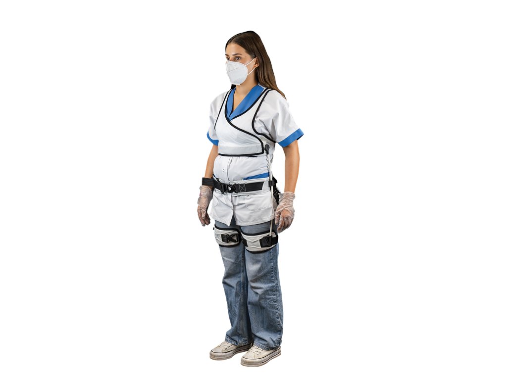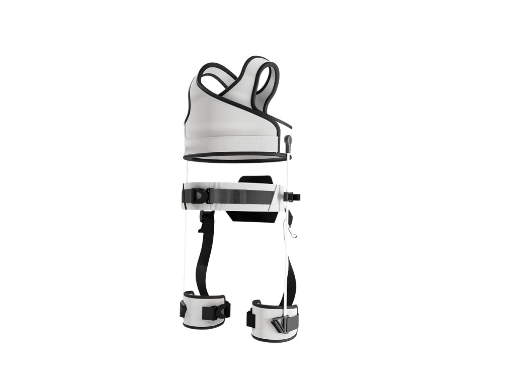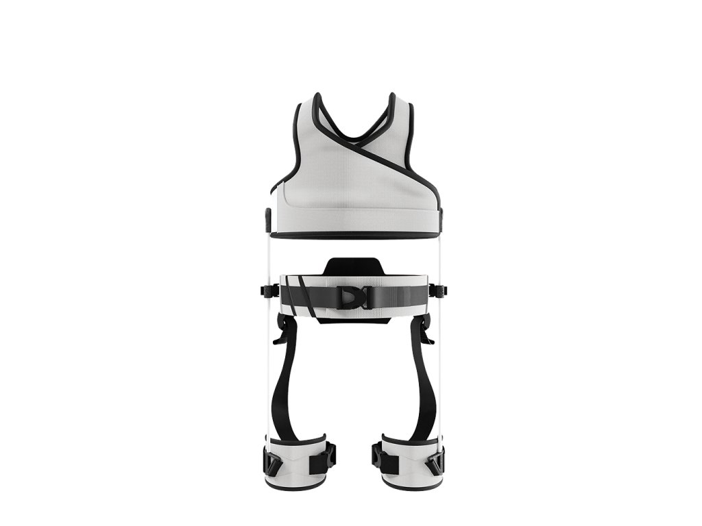 - Postroj (vesta): Umožňuje snadné umístění exoskeletonu na ramena. Postroj podpírá dvě přední pružiny. Šířku vesty lze nastavit pomocí suchých zipů na přední straně.