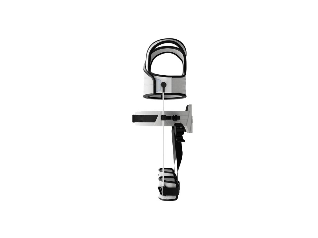 - Bederní pás: Textilní pás umístěný v bederním prohnutí páteře, zapínaný na přední straně pomocí popruhu a spony. Dva protiskrutové popruhy s modrými konci, připojené ke stehenním pásům. Dva předpínací popruhy s červenými konci sloužící k nastavení polohy pružin jsou umístěny na každé straně pásu v úrovni boků a drží pružiny na místě. Destička na zádové straně pásu poskytuje bederní oporu a umožňuje nastavení zadního popruhu.