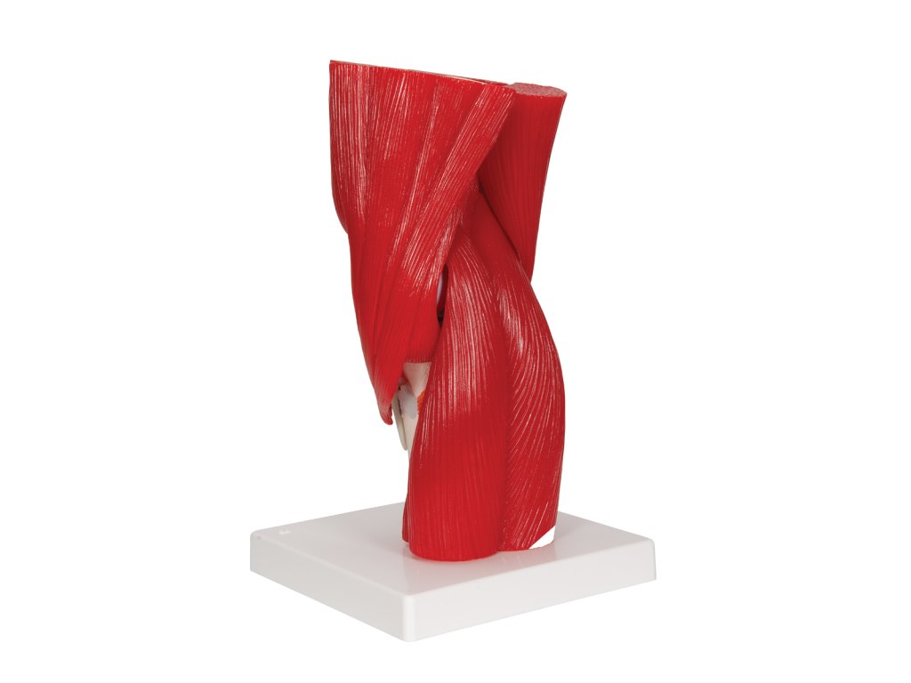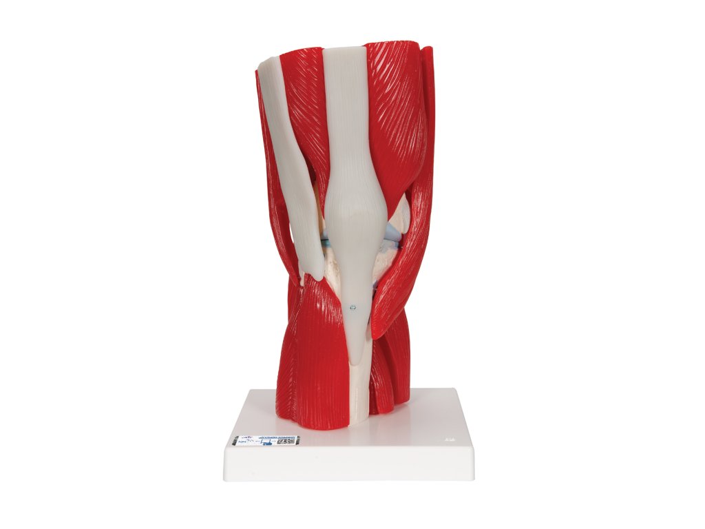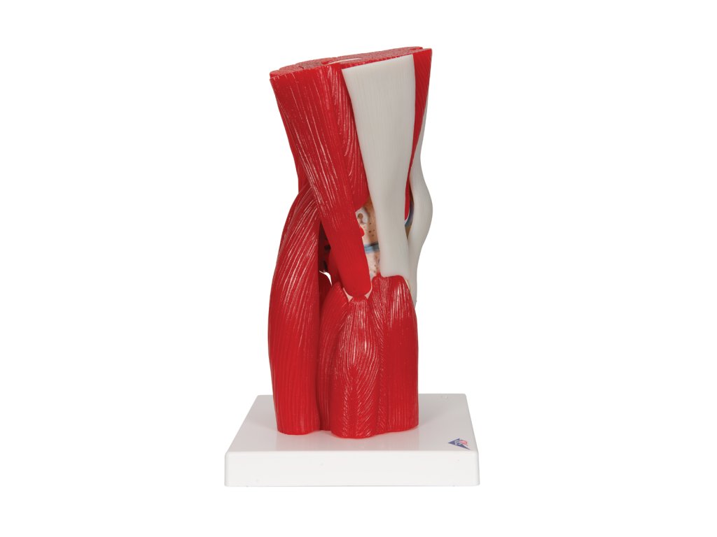 Tento dvanáctidílný model ukazuje různé odnímatelné svaly a svalové části v oblasti kolene. Barevně odlišené a vyvýšené části označují počátky svalů a úpony na kost stehenní, holenní a lýtkovou. Navíc jsou zobrazeny i části vedlejších holenních a lýtkových vazů.