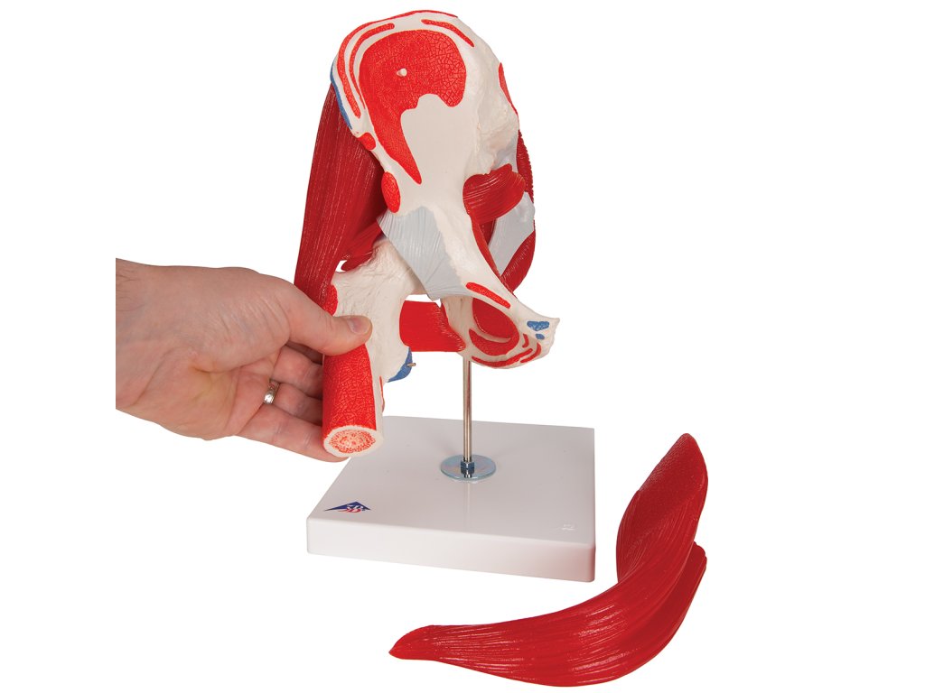 Model znázorňuje pravý mužský kyčelní kloub. Jeho velkou výhodou je doplnění o jednotlivé svaly a také svalové úpony na stehenní a kyčelní kosti. Pro účely výuky jsou svalové úpony a počátky svalů barevně odlišeny.