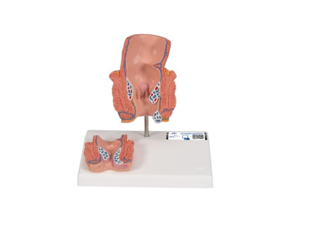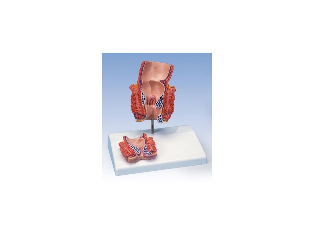Model navrhnutý pro seznámení pacientů s hemoroidy. Model je v životní velikosti přední části konečníku stejně jako menší obrys na podstavci. Dodatek k anatomickým modelům konečníku (svěrač, sliznice, žilní síť), model ukazuje vnitřní hemoroidy v 1. a 2. stádiu stejně jako vnější hemoroidy.