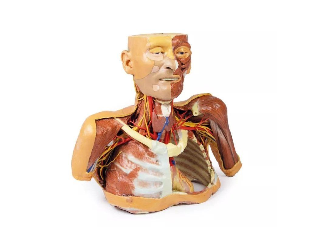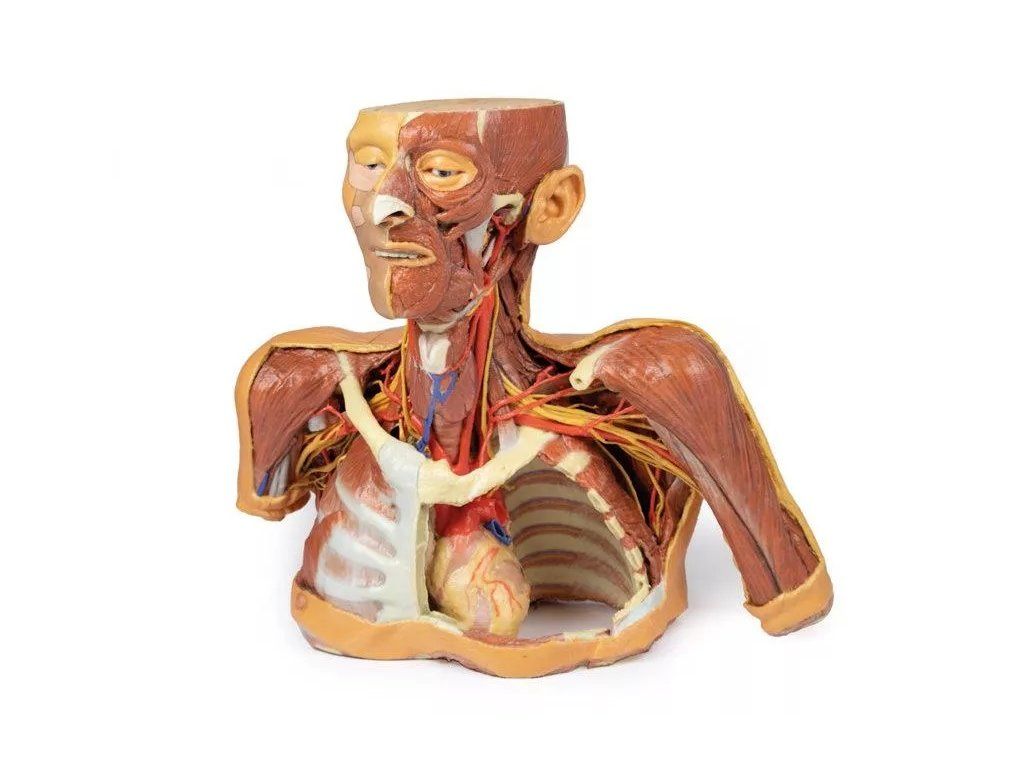 Detailní anatomický model určený pro výuku i odbornou praxi nabízí komplexní pohled na struktury hlavy, krku, hrudníku a podpažní oblasti. Díky kombinaci zachovaných i odkrytých částí umožňuje snadné pochopení vzájemných vztahů mezi orgány, cévami, nervy i svaly.