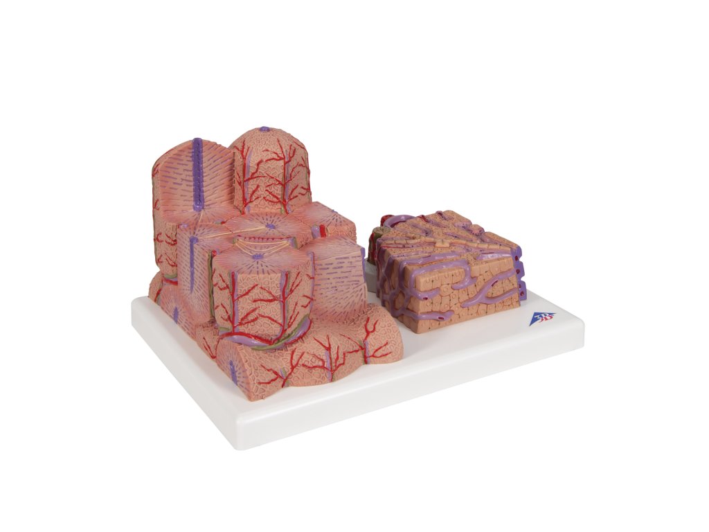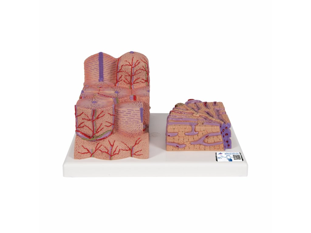 Jaterní lalůček. Na pravé straně repliky uvidíte několik jaterních lalůčků pohromadě s 60 násobným zvětšením. Tato replika je ideální pomůckou pro pochopení fungování a anatomie jater.