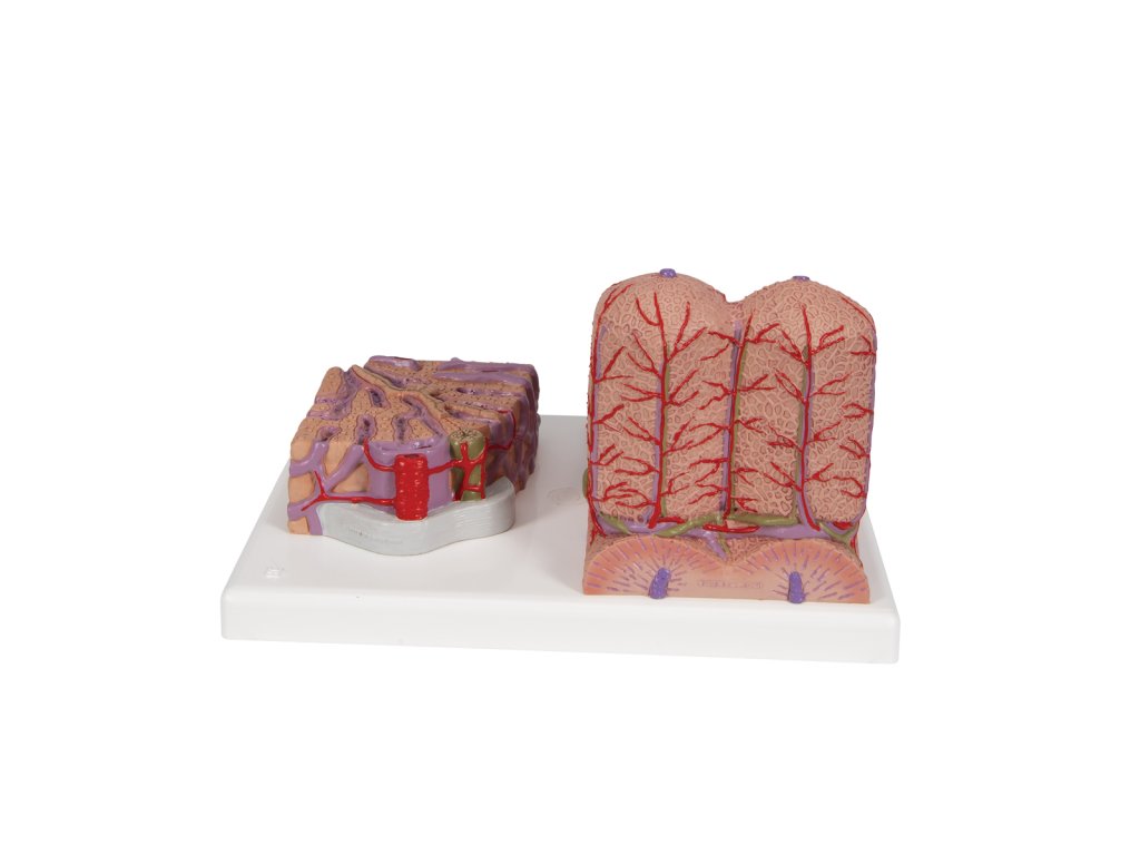 Model lidských jater znázorňuje anatomické struktury, kterým se říká jaterní lalůčky. Mikroanatomický model zobrazuje strukturu funkční a stavební složky lidských jater. Levá část modelu jater člověka zobrazuje 200 x zvětšený