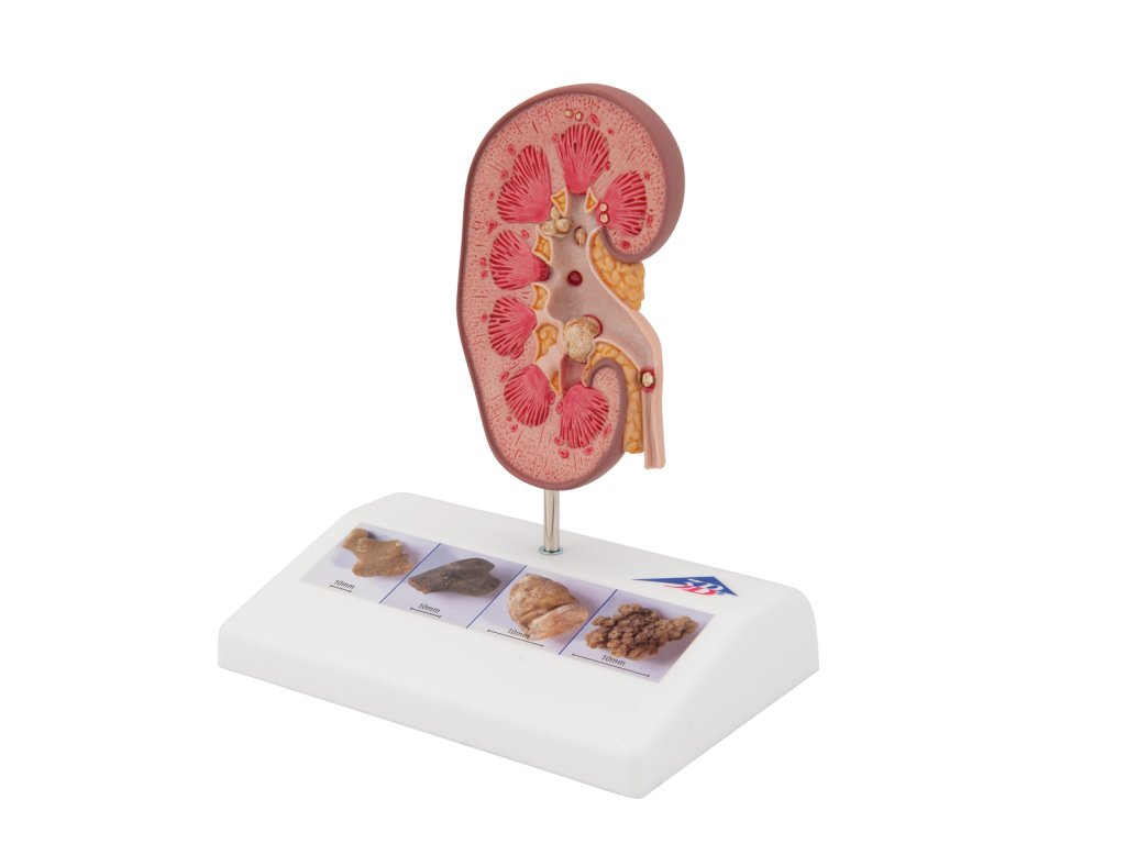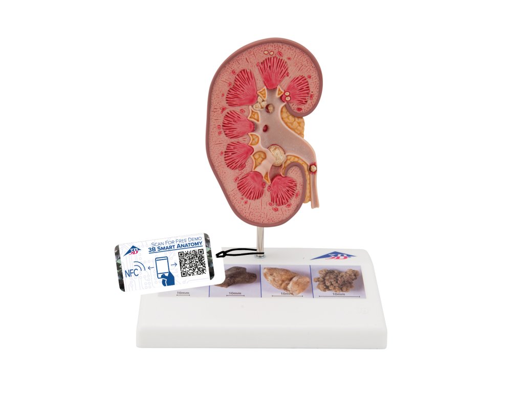 Tento model je dobrá pomůcka k informování pacientů o ledvinových kamenech (nephrolithiasis) a močových kamenů (urolithiasis). Zobrazuje pravou otevřenou ledvinu v přirozené velikosti.
