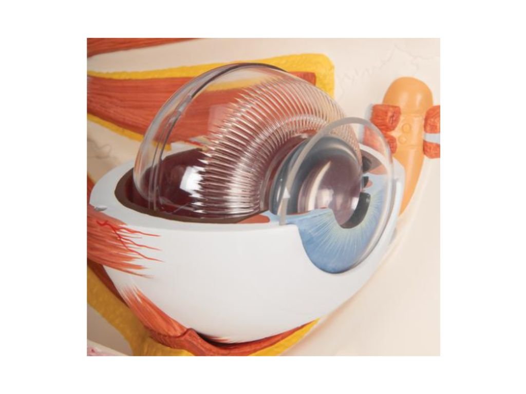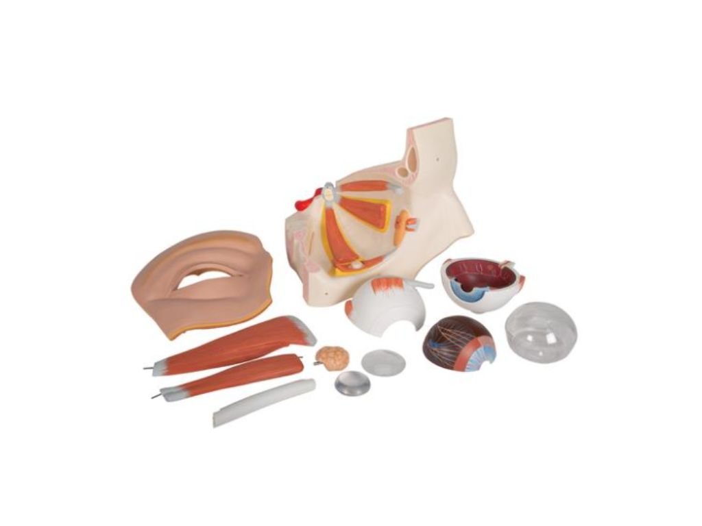 Tento model zobrazuje oko s očními nervy umístěnými v kostním očním důlku (dno a středová stěna). Dodatečně přiřazené struktury umožňují lepší porozumění vztahu mezi okem, kostí, svaly a vnější strukturou oka.