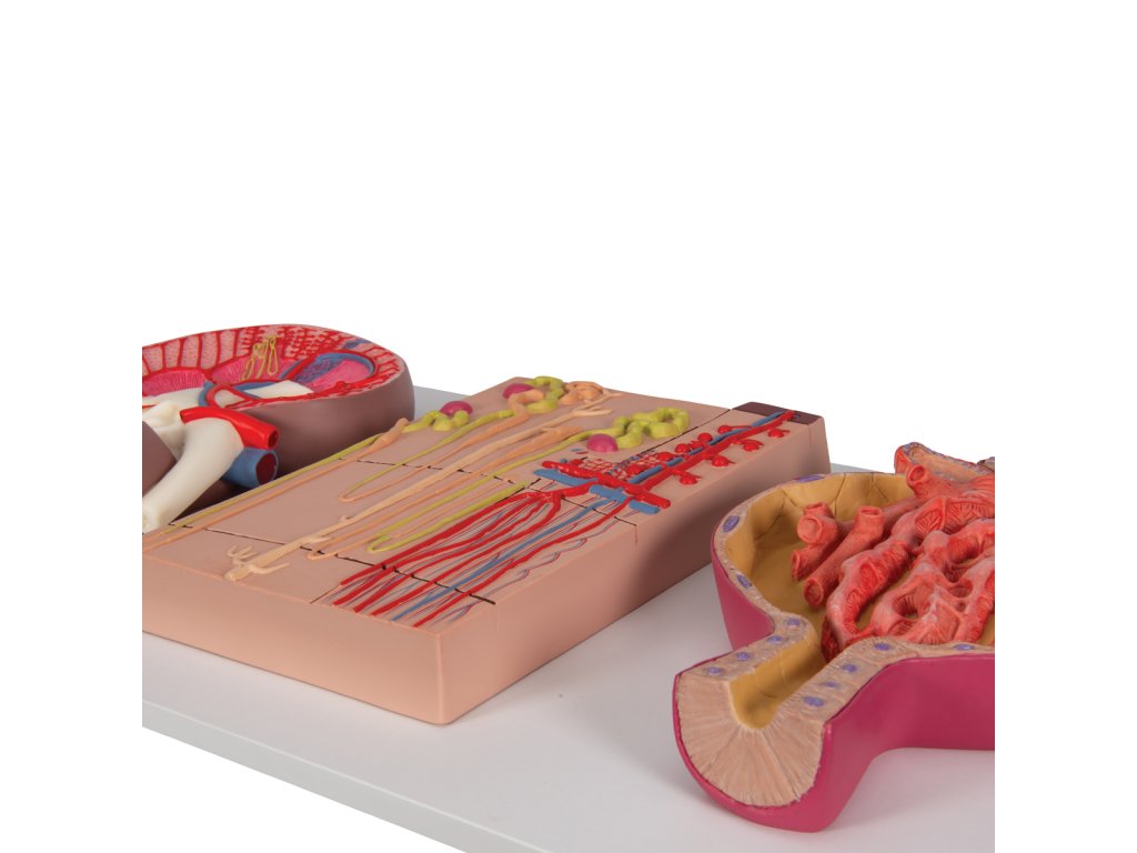 Model je velmi praktickou pomůckou při studiu anatomie lidských ledvin. Na jednou podstavci najdete hned tři různé útvary (řez ledvinou, nefrony s cévami a Malpighiho tělísko), které mají různé zvětšení a utváří tak komplexní ukázku vnitřní stavby tohoto důležitého orgánu.