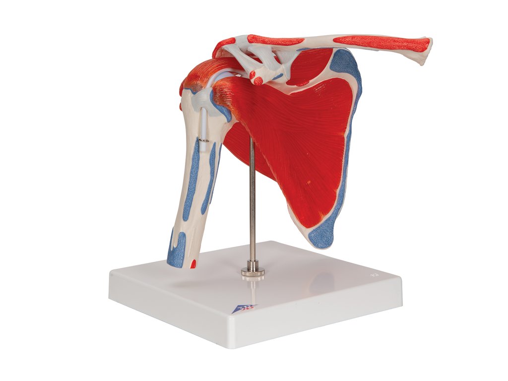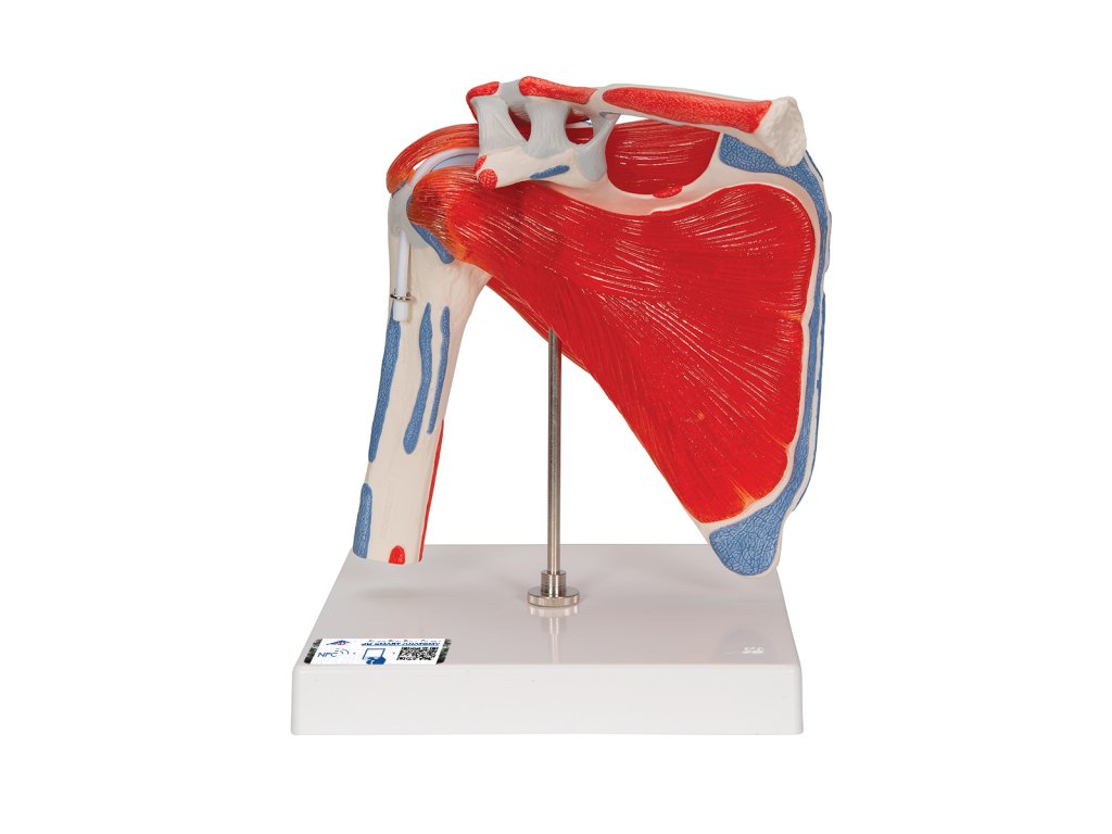 Tento model ramenního kloubu se skládá z horní poloviny kosti pažní, klíční kosti a lopatky. Zobrazeny jsou také svaly kloubu a jejich úpony, které jsou barevně zvýrazněny.